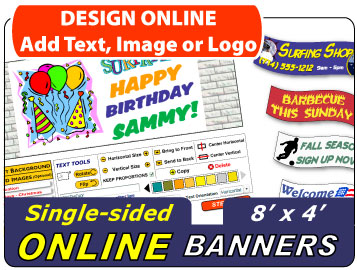 We offer several options for ordering a custom printed 8x4 Banner. You can Design Online (Online Banners), Upload Your Own Design (Custom Banners) or We'll Design For You (Text Banners). Please select the option you prefer below: